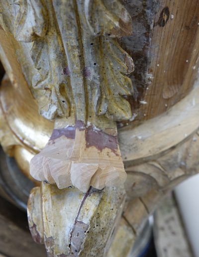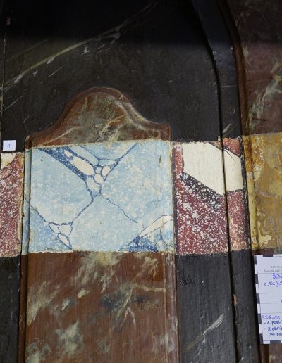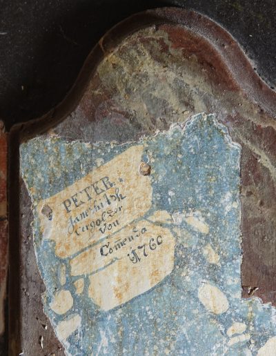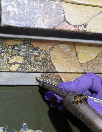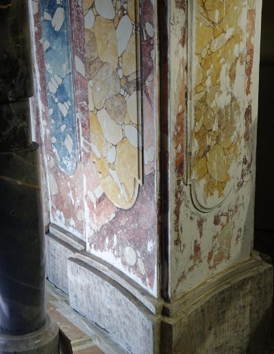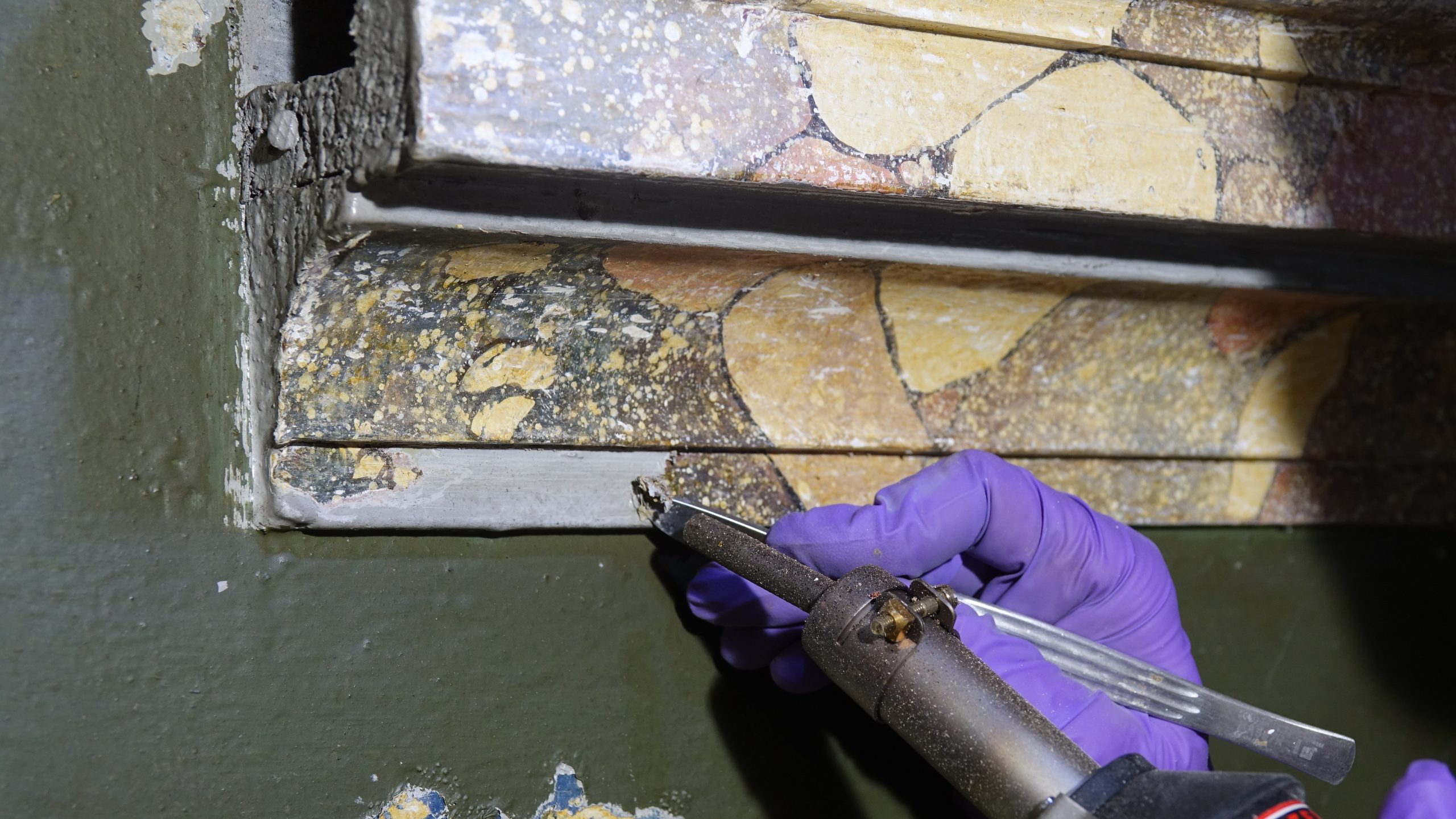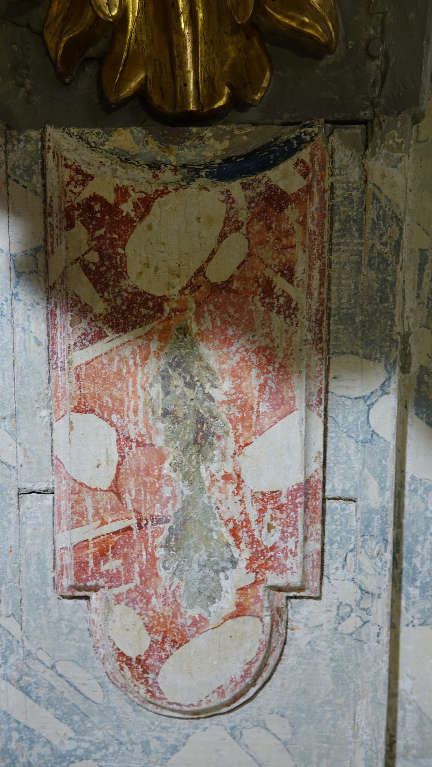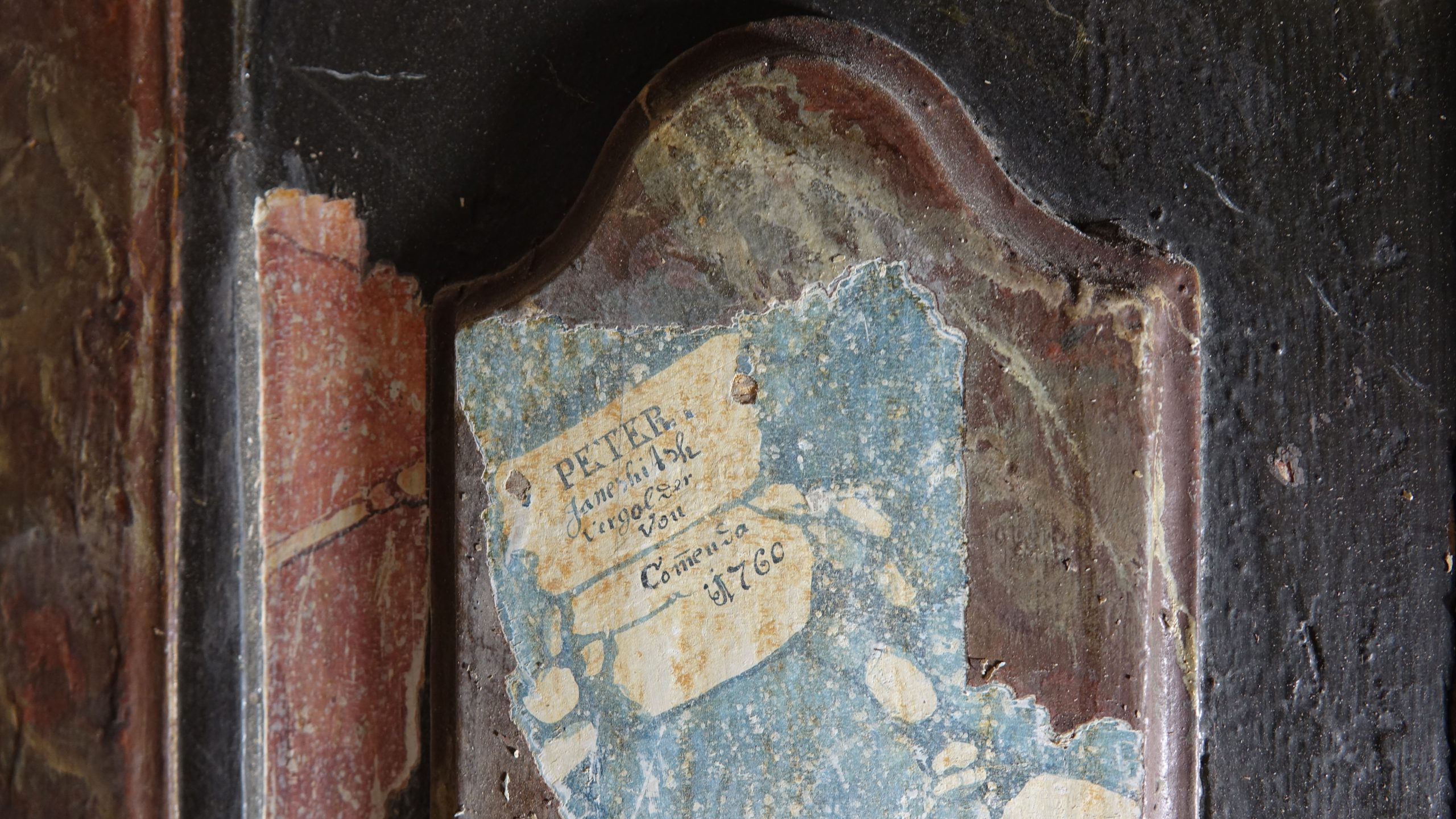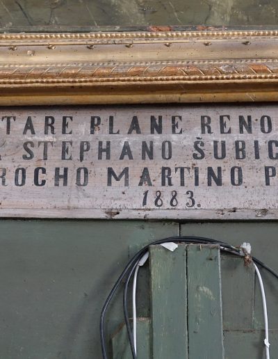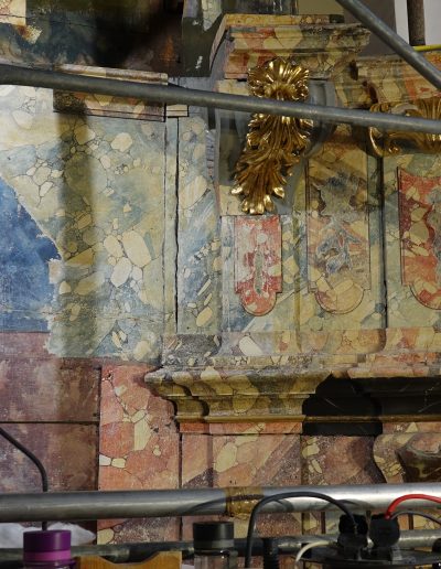 Med posegom smo izvedli obsežno sondiranje in naravoslovne raziskave, s katerimi smo identificirali več plasti barv in pozlate. Odkrili smo dobro ohranjeno baročno poslikavo stene za oltarno nišo freskanta Franca Jelovška ter signaturo slikarja Petra Janežiča iz leta 1760, ki je potrdila njegovo delo kot slikarja in pozlatarja.