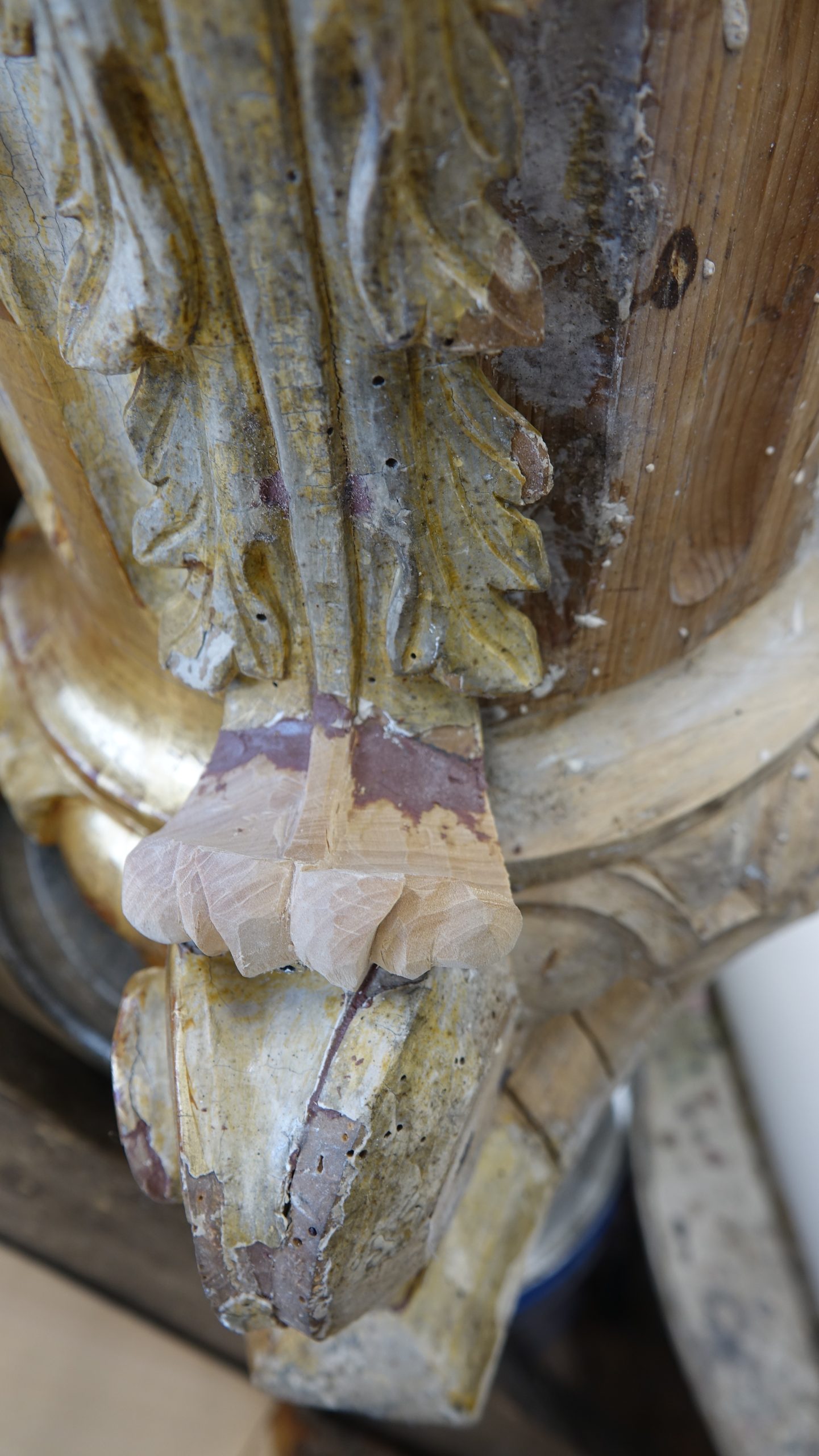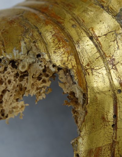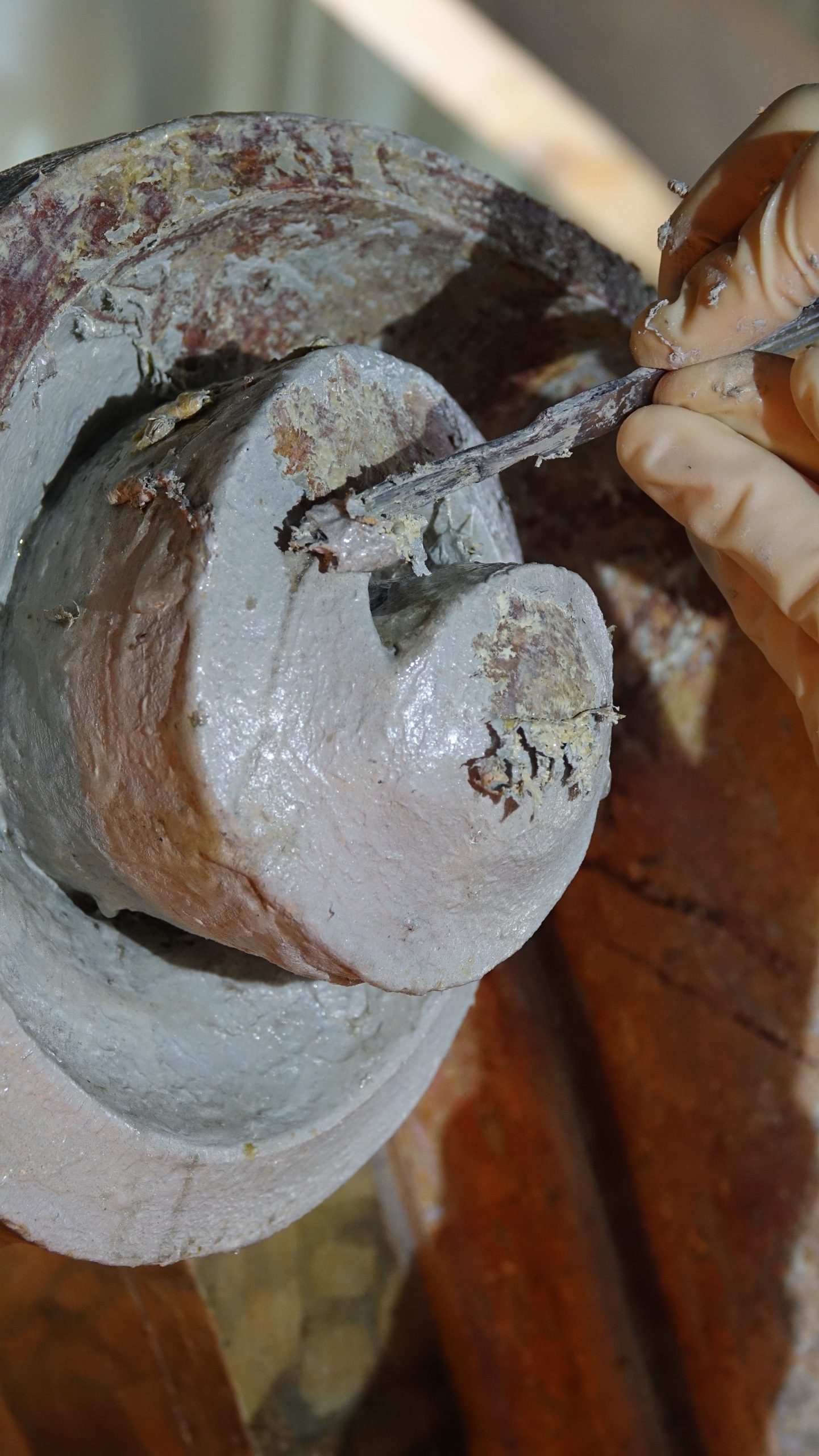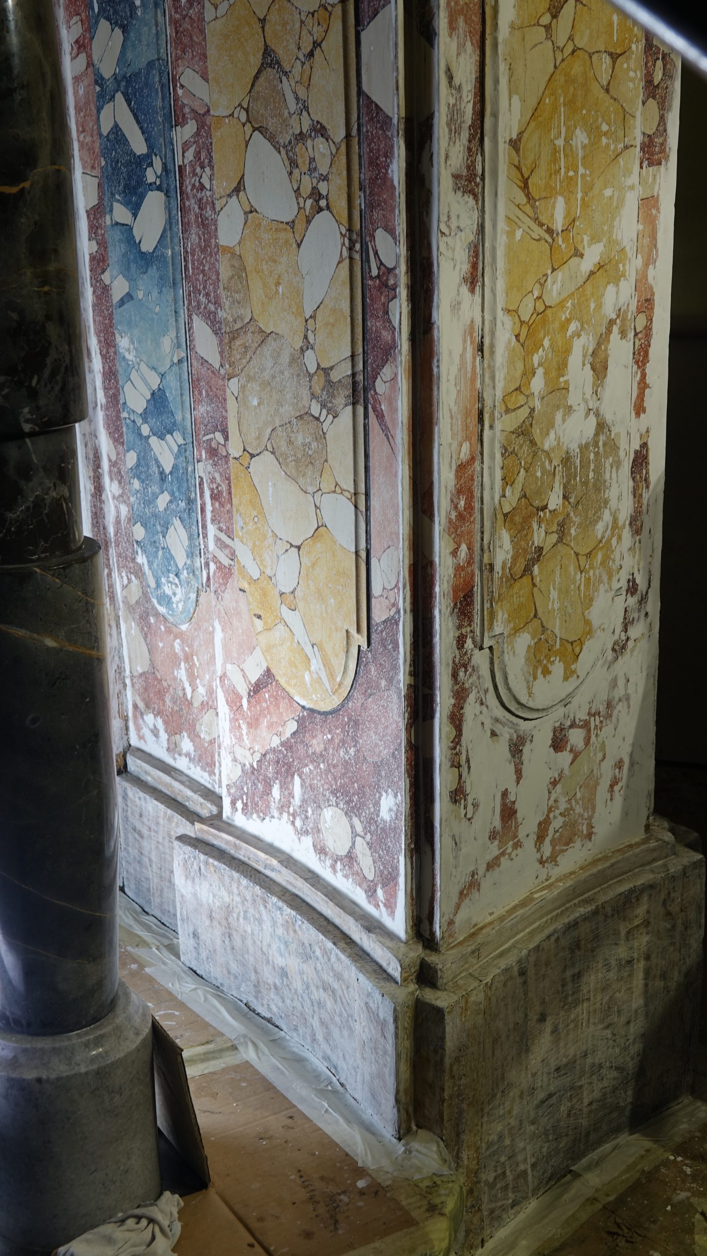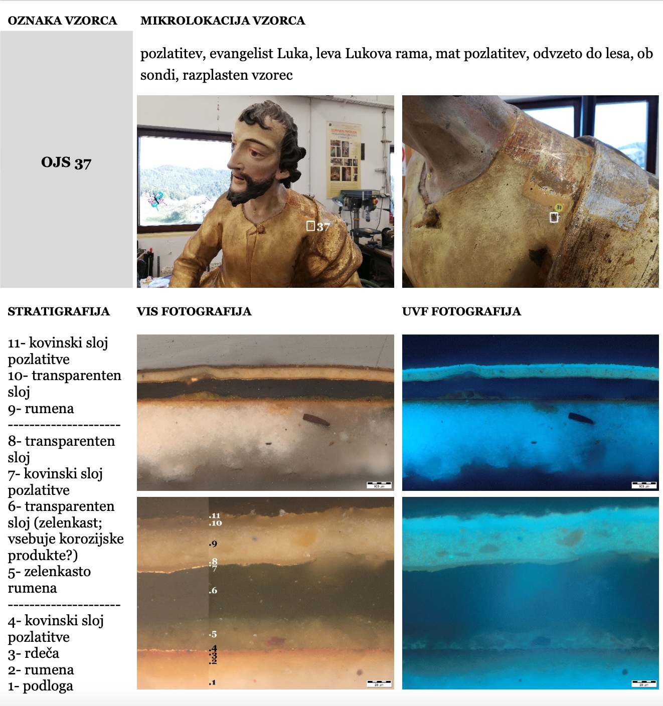 Med posegom smo izvedli obsežno sondiranje in naravoslovne raziskave, s katerimi smo identificirali več plasti barv in pozlate. Odkrili smo dobro ohranjeno baročno poslikavo stene za oltarno nišo freskanta Franca Jelovška ter signaturo slikarja Petra Janežiča iz leta 1760, ki je potrdila njegovo delo kot slikarja in pozlatarja.