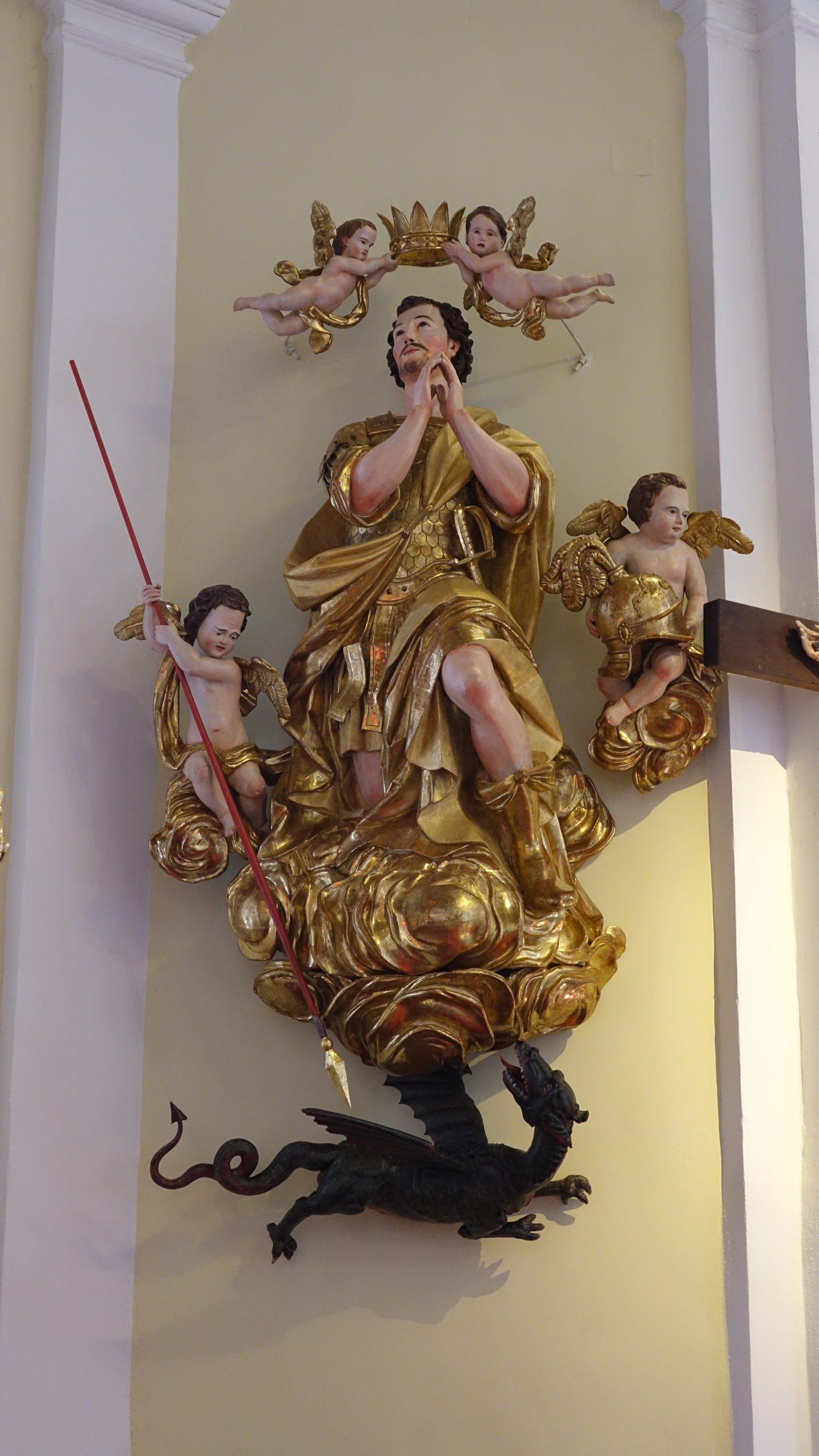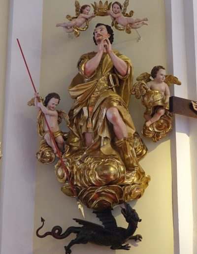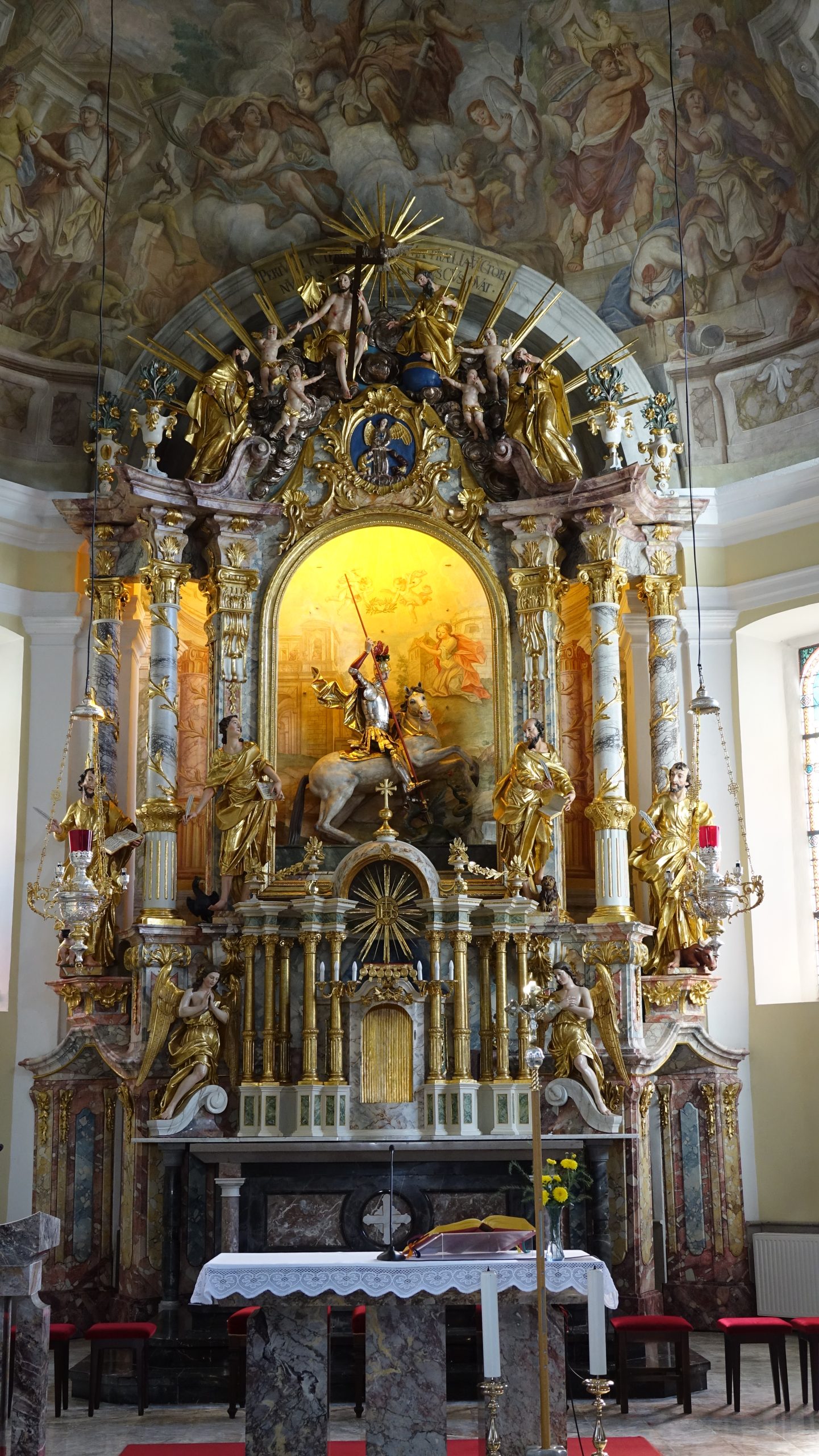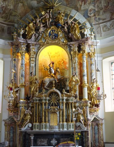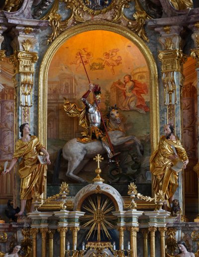 Poznobaročni oltar iz sredine 18. stoletja meri dobrih 9 metrov v višino in 6 metrov v širino. V 19. stoletju ga je predelala podobarska delavnica Štefana Šubica, ki je med drugim prestavila baročnega konjenika v nišo na fasadi, v oltar pa postavila nov kip sv. Jurija v poveličanju. Oltarju je dodala štiri stebre, okvir oltarne niše in nov tabernakelj z angeloma adorantoma. Restavratorska ekipa se je soočila z vprašanji o prezentaciji prvotne baročne polikromacije ter ohranjanju Šubičevih dodatkov, pri čemer smo se skupaj s strokovno komisijo odločili za kombinirano rešitev: ohranili smo prvotne barvne plasti tam, kjer so bile ohranjene, ter Šubičeve posege na sekundarnih elementih.